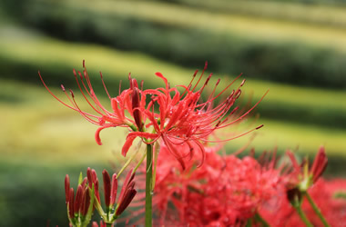 | 9月下旬、秋雨前線の停滞する中、わずかな晴れ間を見つけて、吉和の里の別荘を起点に芸北の秋を確かめてきました。戸河内インターで一旦高速を降り、農協構内にあるパンの店で前から買おうと思っていた米粉パン(モチモチして絶品の上、適正価格)と昼食用弁当を買い、井仁の棚田へ向かいました。棚田はあいにく稲刈りが大方終了しており、彼岸花と稲穂の風景写真とはいきませんでしたが・・・その後向かった別荘近辺は栗林が多く、ベランダ前の空き地で食べきれないほどの山栗を拾いました。小ぶりですが甘くて美味しかったです。 | ![]() 彼岸花 |
